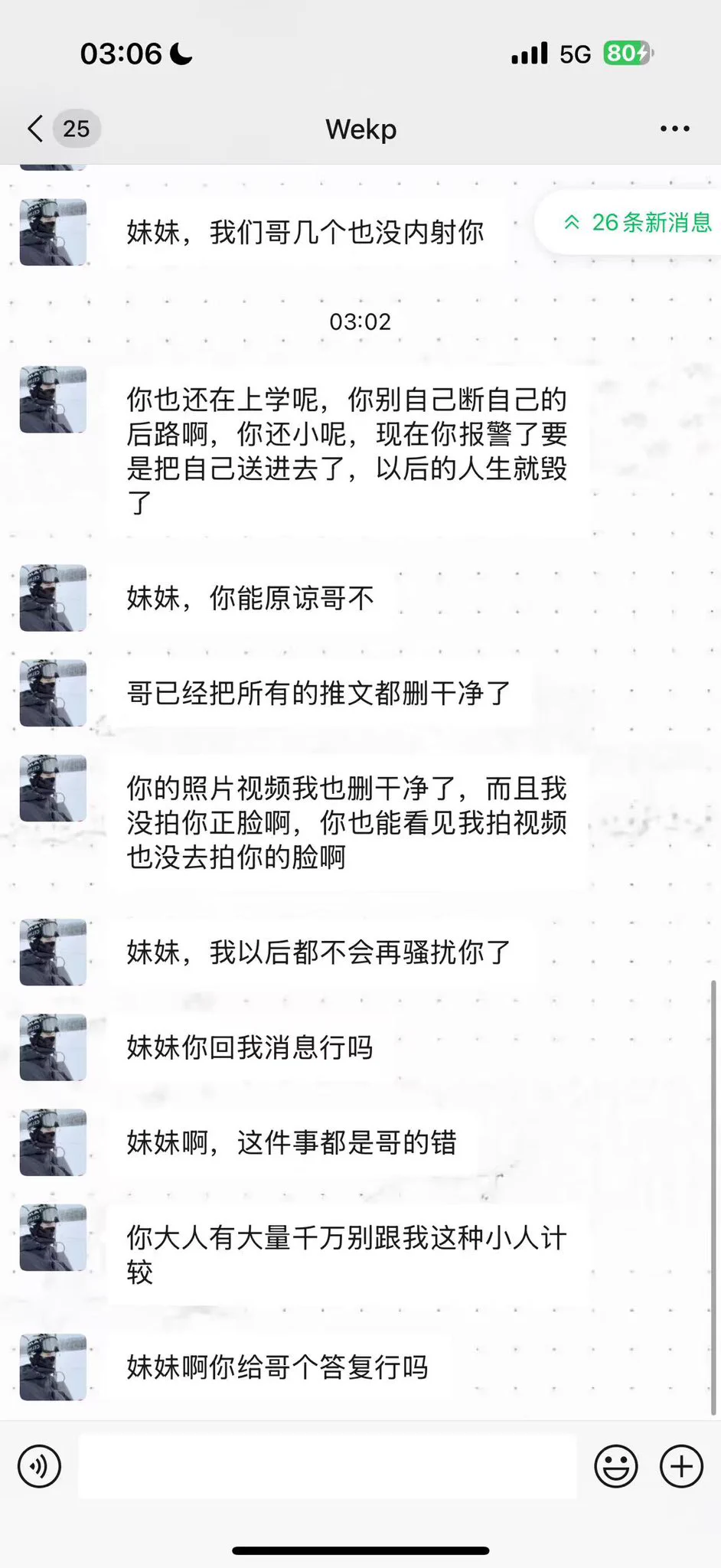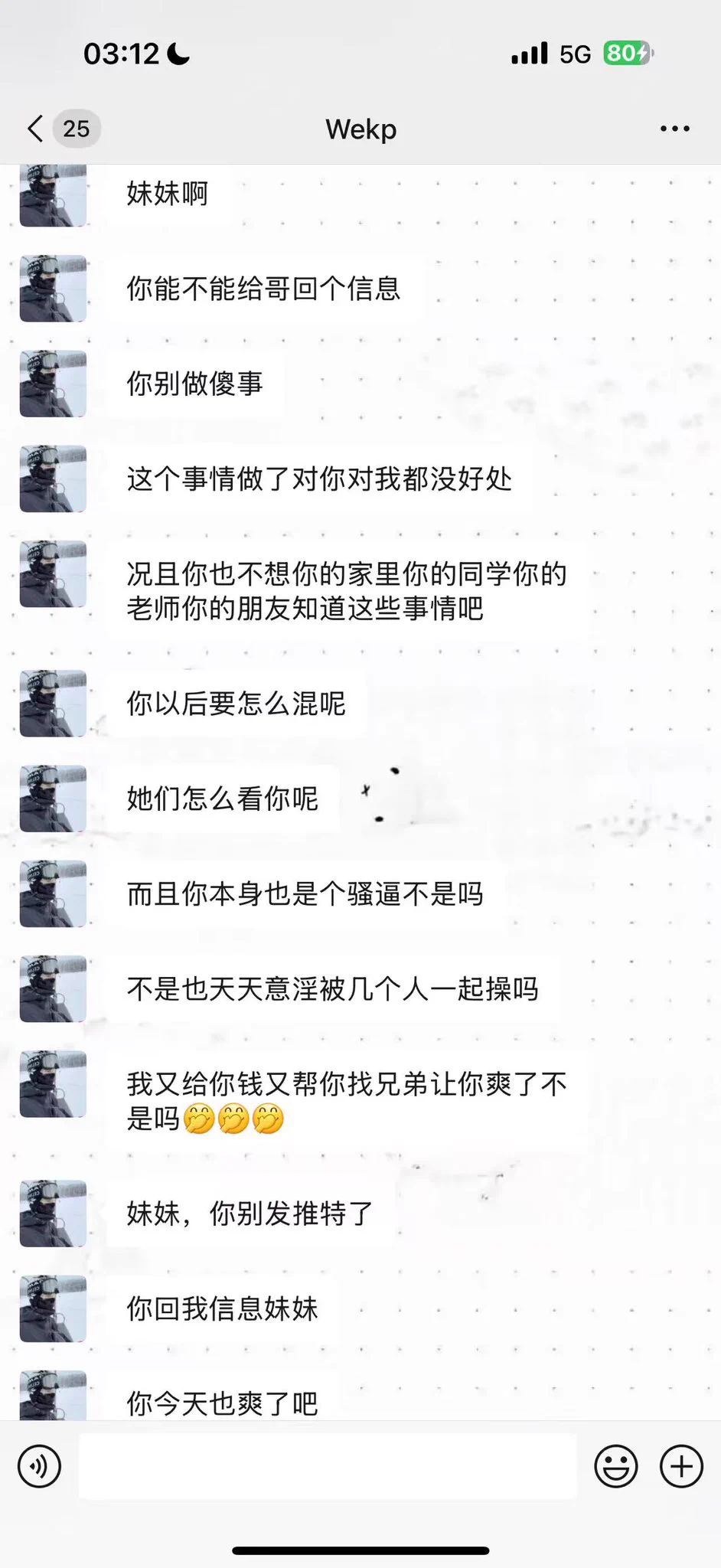 他们几个说如果我要是报警就会把我在学校里和他们操逼这件事情举报出来,并且我收费了这是嫖娼 我也要进去 我还玩推特… 传播色情 只要我报警就和我鱼死网破…